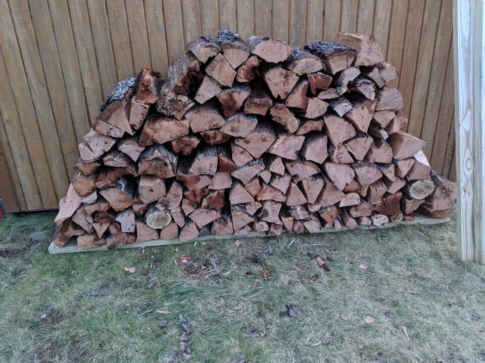 I wanted to make sure that the wood doesn’t rot. Pro:tip, put down two treated lumber 2x4s. The firewood will have room to breathe, but the lumber won’t rot due to the treatment. Anyway, now that the lumber is down, time to start stacking.