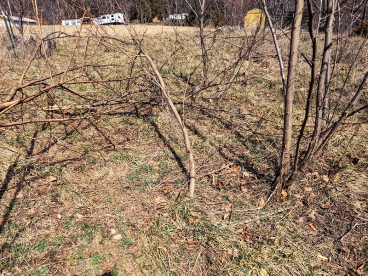 Fortunately, the kind farmer continues to cut the grass for me. And by that, I mean he is actively growing and harvesting hay off the land. That’s a huge help for me because the land can regrow forests extremely quickly in this area. However, the area of the orchard became extremely overgrown and lots of volunteer trees (with super sharp thorns) came up.
